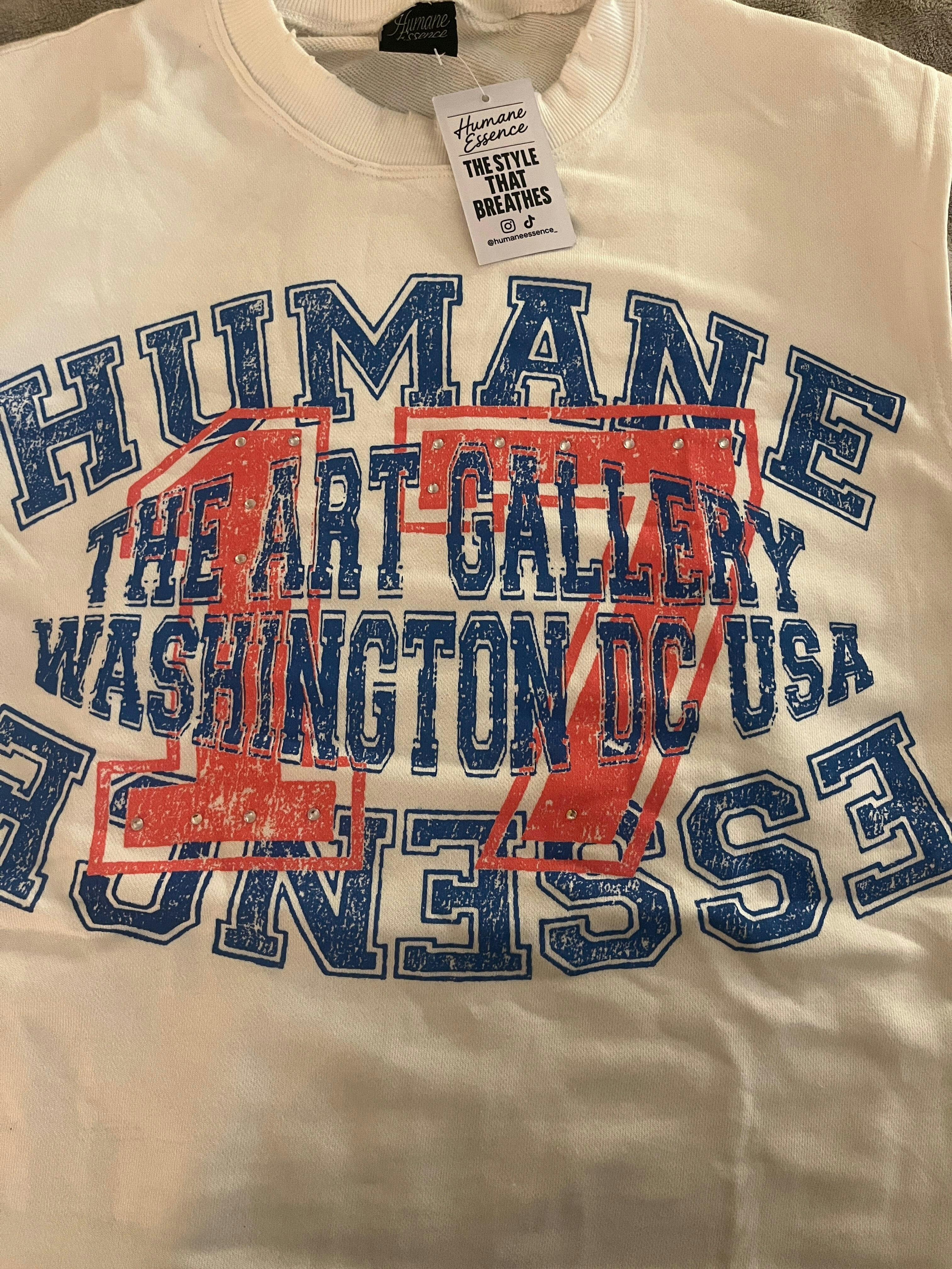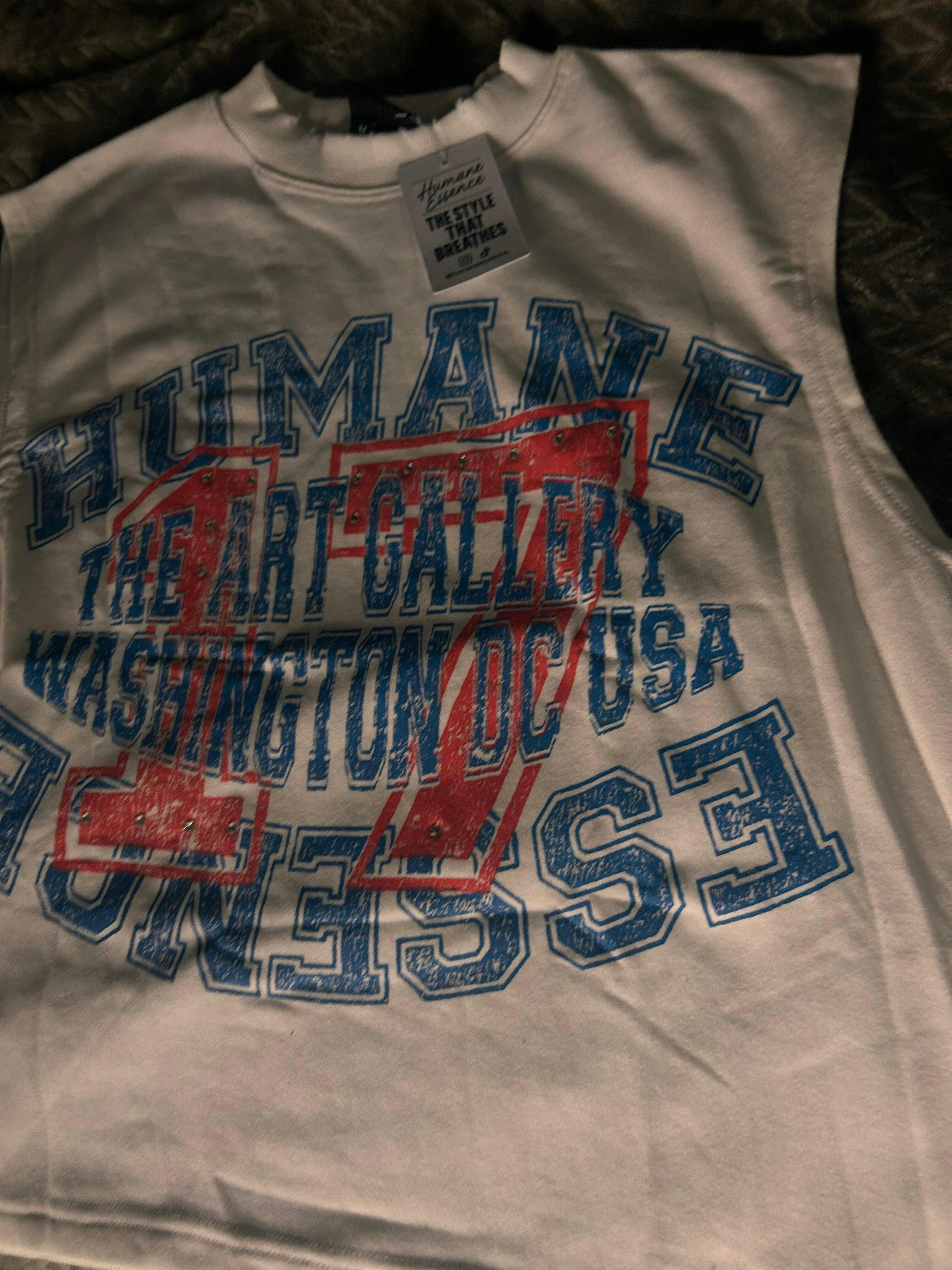 Super comfy white cotton sleeveless shirt with a bold Humane Essence design and rhinestone details—love how unique and stylish it looks!